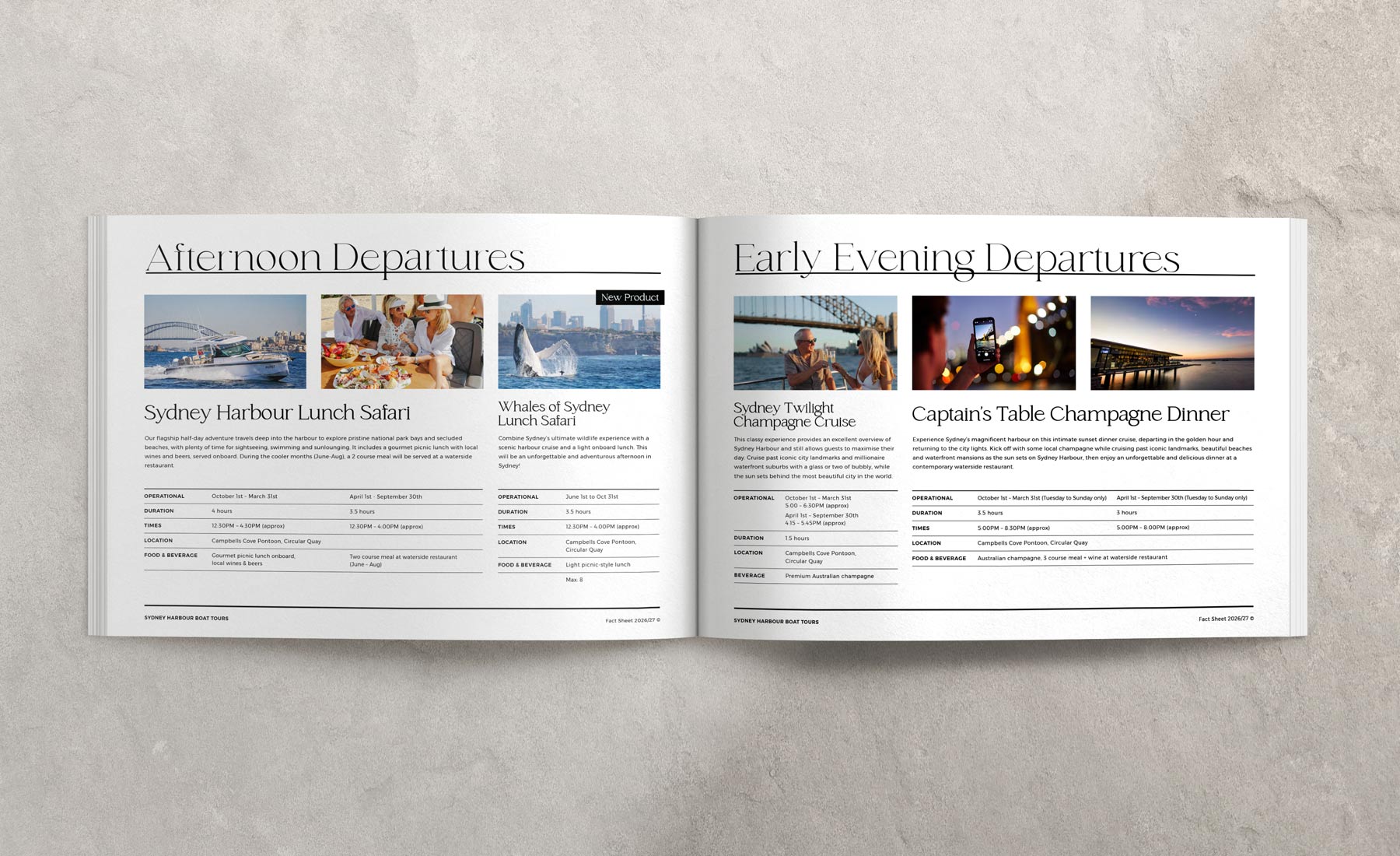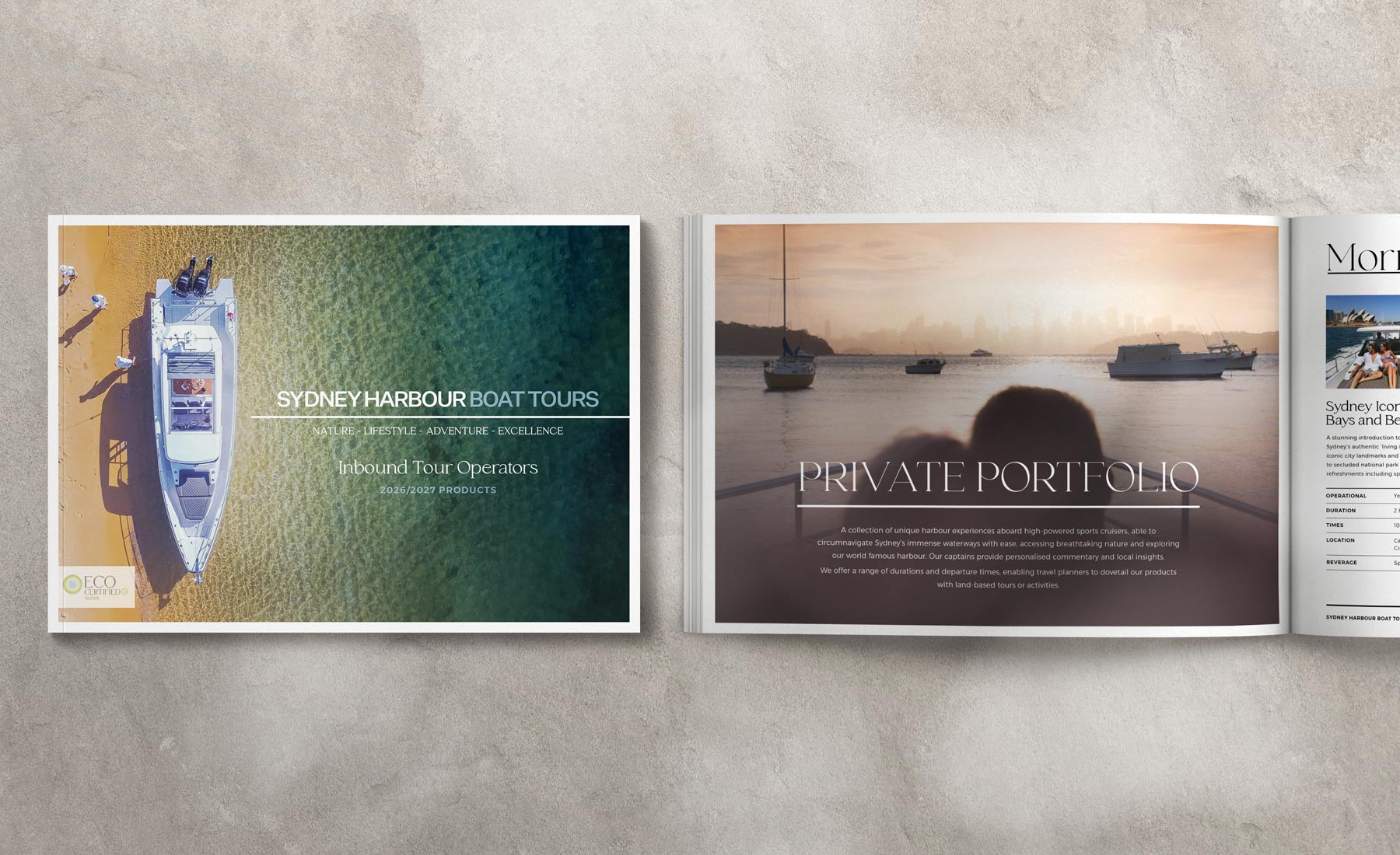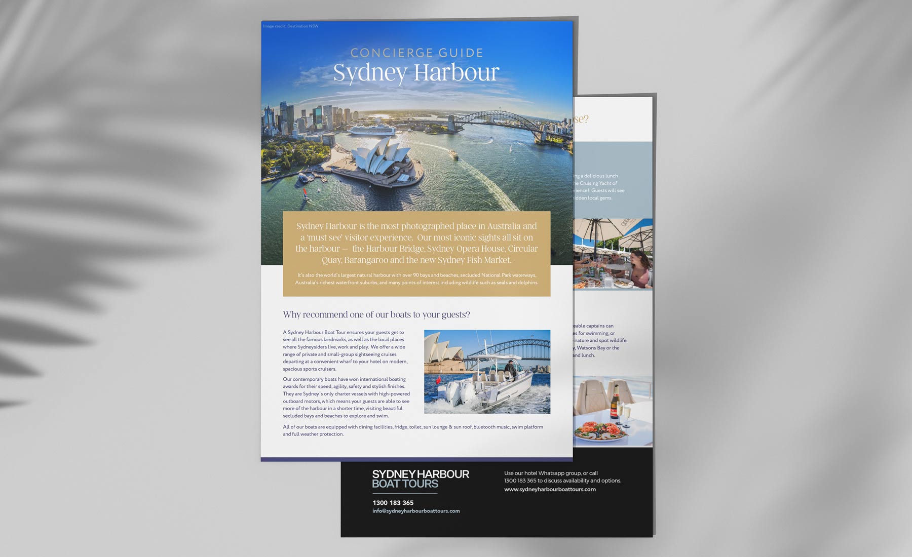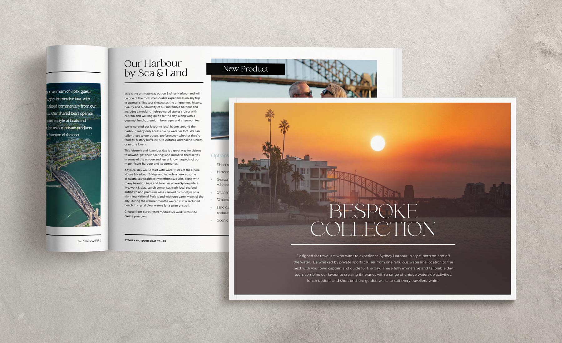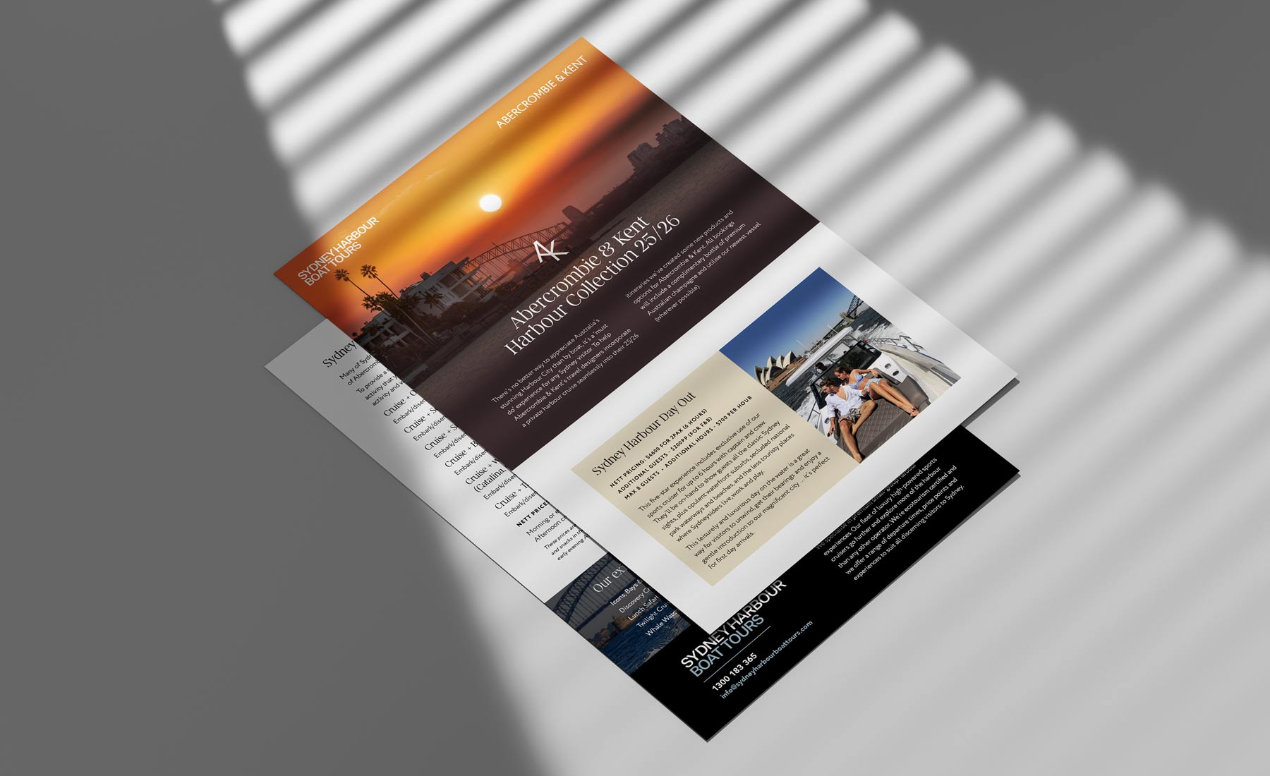 A suite of luxury marketing brochures for Sydney Harbour Boat Tours, designed to elevate the brand and appeal to premium travel partners. The range includes both print and digital flyers, crafted for distribution to local tour operators and hotels, with a strong focus on refined typography, elegant layouts and aspirational imagery to position the experience at the top end of the market.